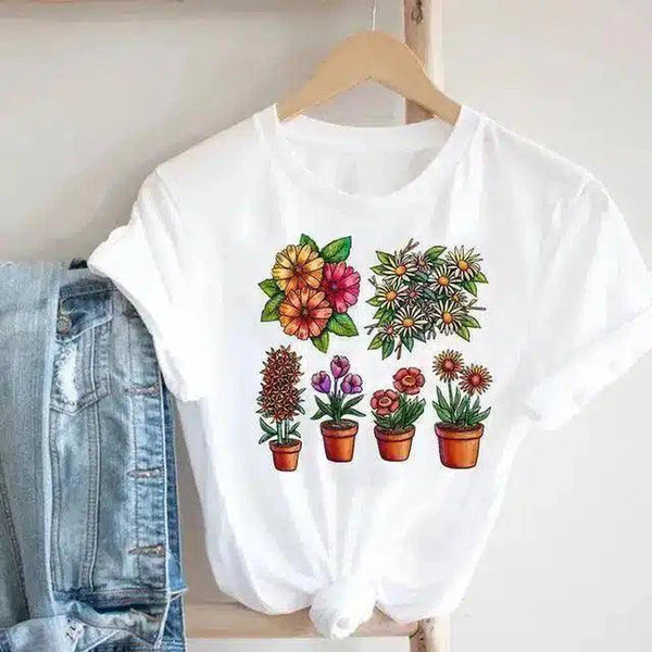 Bloemen Potplanten Bedrukt T-shirt voor Vrijetijdskleding