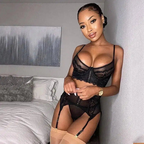 Productomschrijving: Driedelige dameslingerie met kanten wimperstiksels