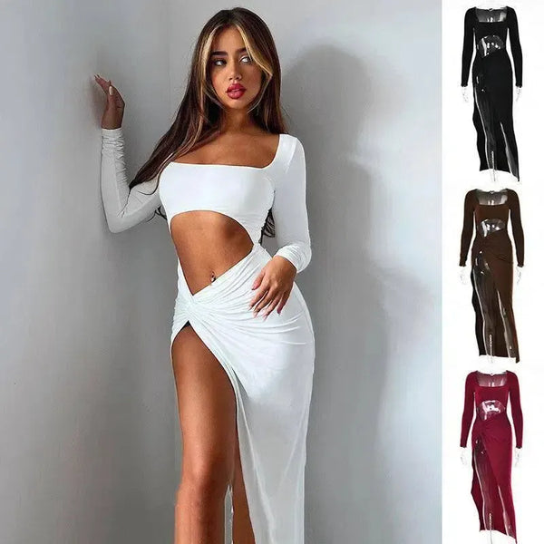 Dameskleding Lange Mouw Jurk Fashion Holle U-hals Split Jurk Party Wedding