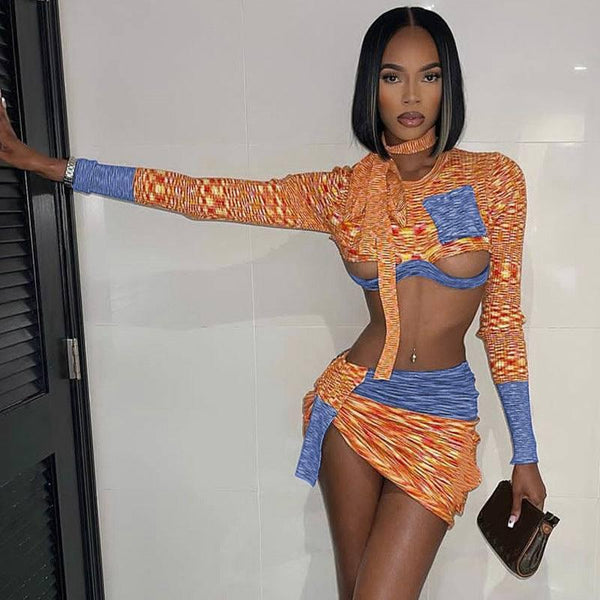 Gebreide lange mouwen Cropped Top Slim Rok Suit