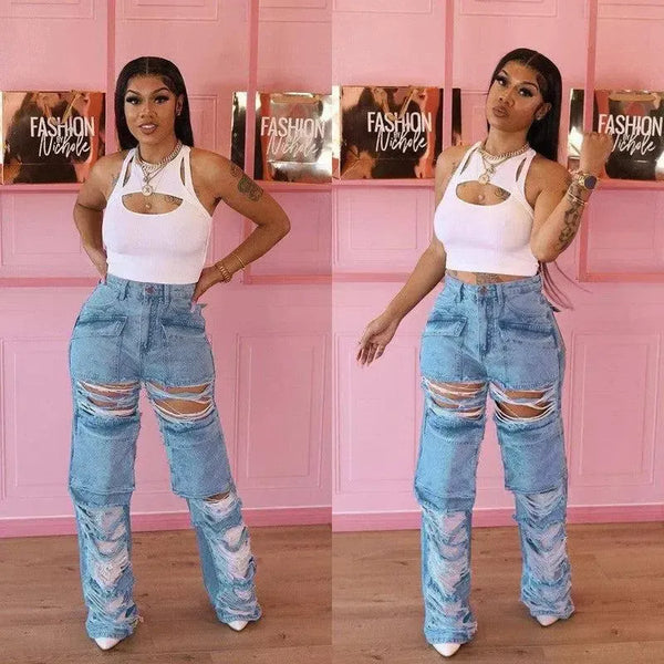 - Stijl: Women's High Waist Zipper Straight Ripped Jeans