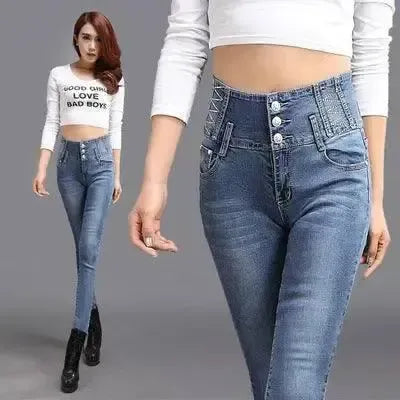 nieuwe hoge taille gesp stretch jeans Koreaanse vrouwen