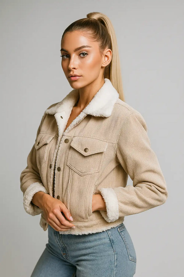 - Halslijn: Klassieke kraag met imitatiebont detail