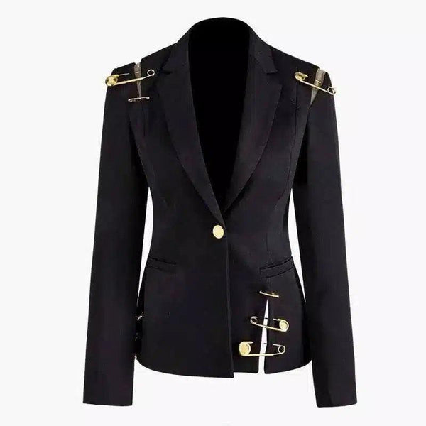 - Hals/Schouder Stijl: ingekeepte revers met decoratieve schouder details