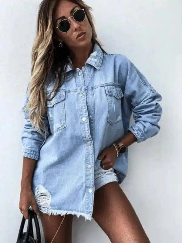 - Toegevoegde kenmerken: Twee borstzakken met knoopkleppen; distressed details op de zoom