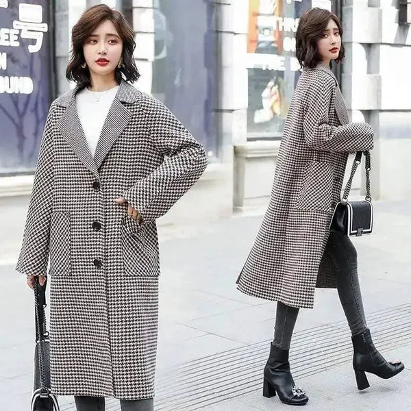 - Timeless Houndstooth Overcoat: Verfraai je garderobe met dit klassieke en geraffineerde stuk, perfect voor een gepolijste look bij koeler weer.