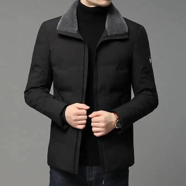 - Halslijn: Opstaande kraag met een contrasterende binnenvoering