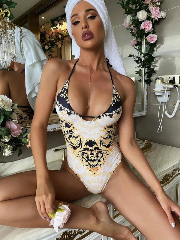 - Stijl: Eendelig badpak met retroprint en bikinisilhouet
