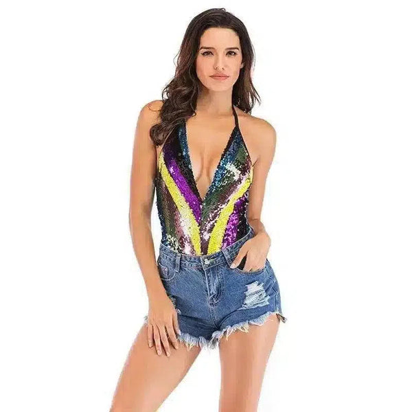 Pailletten Halter Bodysuit & Gescheurde Denim Shorts