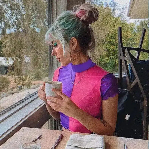 contrasterende naveltop van mesh met korte mouwen
