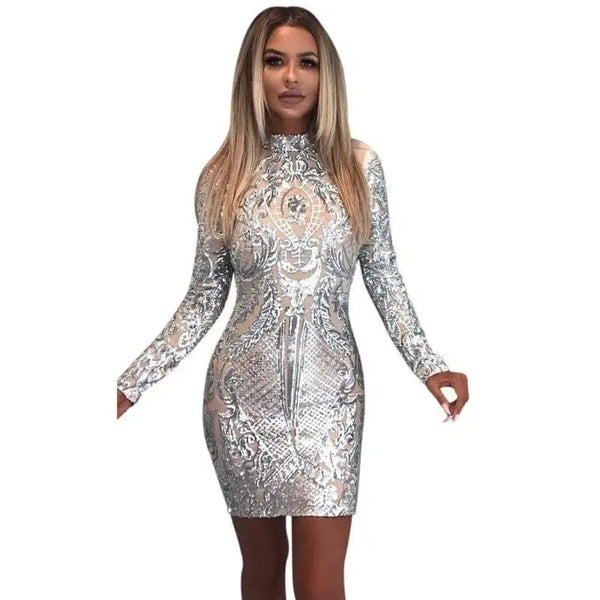 Hooggesloten elegante feestjurk met lange mouwen en lovertjes