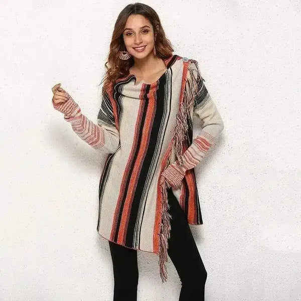 - Aanvullende details: Asymmetrische zoomlijn met franje details; gedurfd gestreept patroon in neutrale en warme tinten