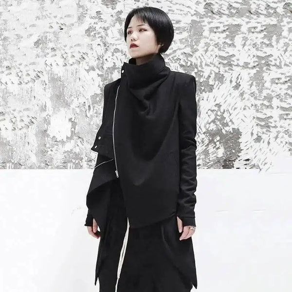 Turtleneck Lange Mouw Zwart Rits Onregelmatige Jas