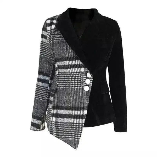 - Designdetails: Contrasterende ruit en effen lambrisering, double-breasted met sierknopen