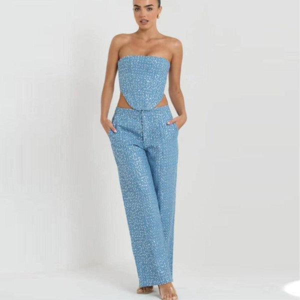 Mode Denim Pailletten Tube Top Wijde Been Broek Suit