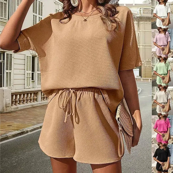 Nieuwe Waffle Suit Vrouwen Bat mouwen korte mouwen Crew-hals Top en koord ontwerp Shorts Fashion Tweedelige Set Zomerkleding