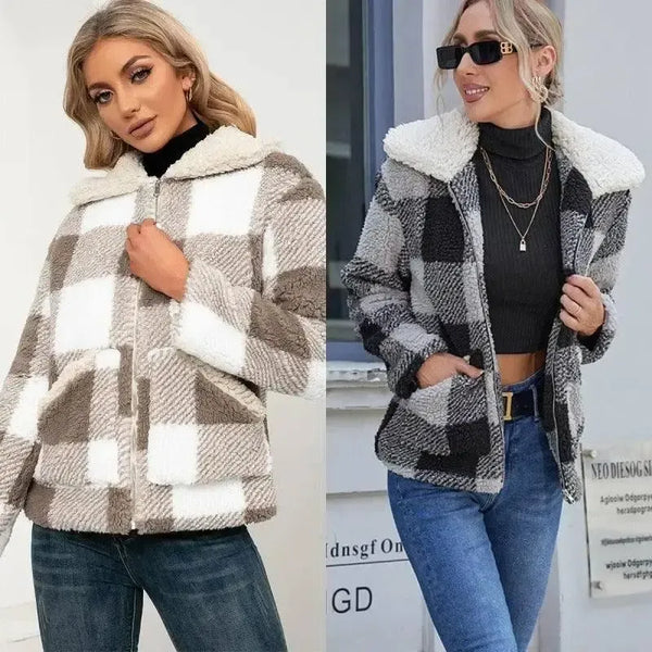 Casual geruit jasje met pluche kapel Lamsvacht geruit zakje Top
