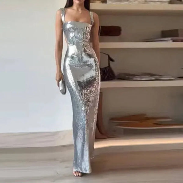 Pailletten Sling Vierkante Kraag Rugloze Jurk Rok