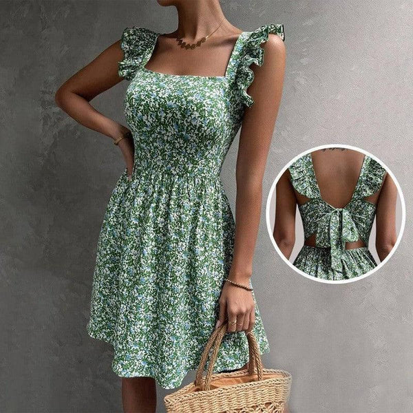 Zomerse vierkante hals gerimpelde mouwloze jurk met strikje